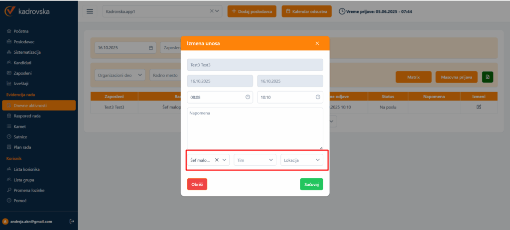 Pošto smo sada omogućili atributiranje rada na nivou perioda to se atributiranje može vršiti direktno iz dnevnih aktivnosti. Ovo praktično znači da možete u toku dana raditi na više različitih radnih mesta ili u različitim timovima.