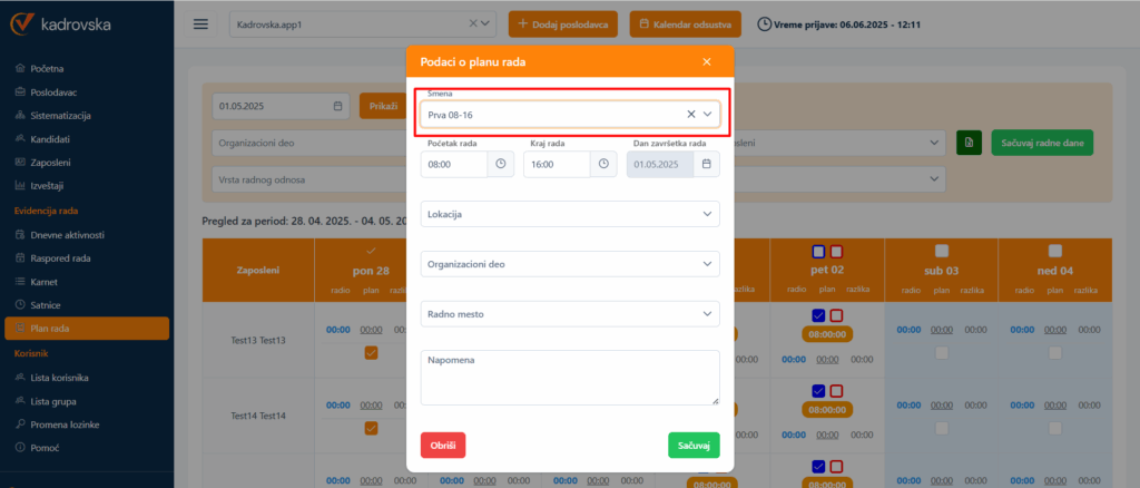 - Mogućnost biranja vremena iz smena kod planiranja rada