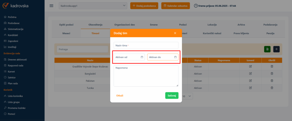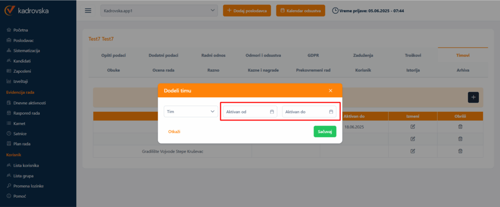 Kod kreiranja timova (Poslodavac-Timovi) i dodeljivanja zaposlenog timu (Zaposleni-Timovi) dodali smo vremensku dimenziju trajanja tima, odnosno trajanja pripadnosti timu.